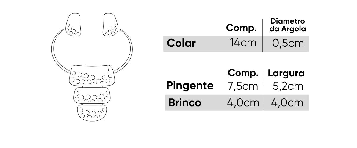 O conjunto acompanha um par de brincos coordenados, seguindo o mesmo acabamento martelado e formato orgânico — o complemento perfeito para harmonizar o visual.