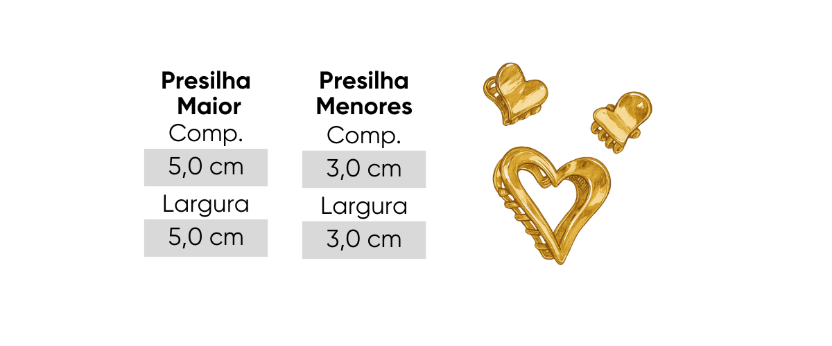 O Conjunto Maria traz um toque romântico e sofisticado para os cabelos, com três presilhas em formato de coração, todas em acabamento dourado espelhado que reflete a luz com elegância.
