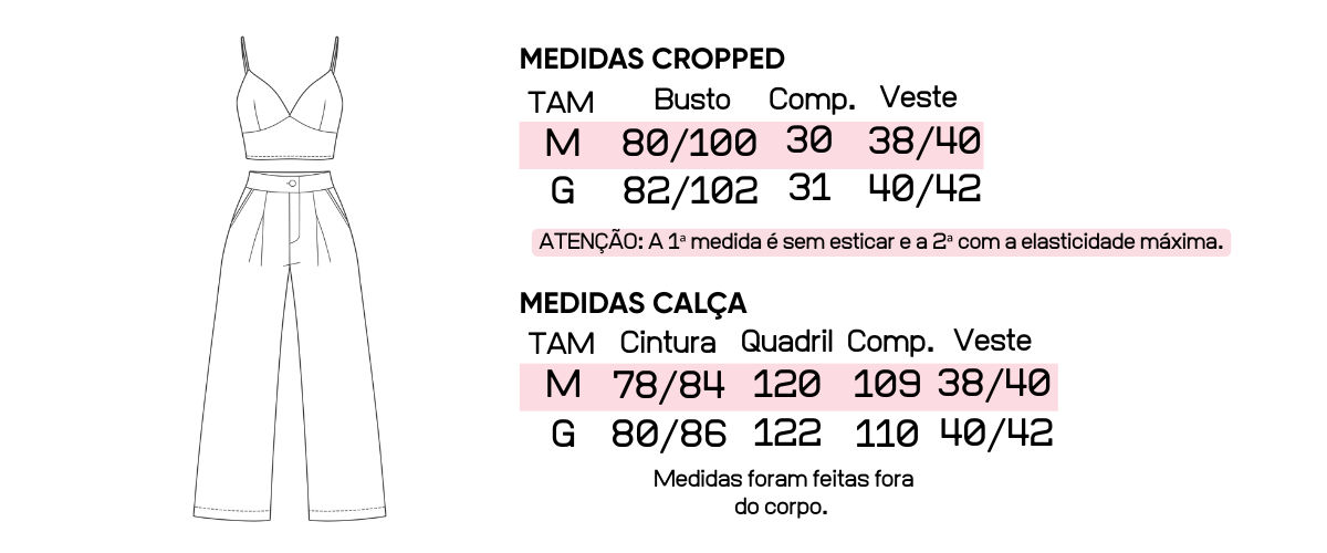 O cropped possui bojo embutido que valoriza o busto e garante sustentação, além de alças finas e decote em “V”, trazendo feminilidade e charme à peça. Já a calça pantalona de cintura alta apresenta cós estruturado com fechamento em botão e zíper, além de pregas frontais que oferecem elegância e movimento. A modelagem ampla alonga a silhueta e garante fluidez ao visual.