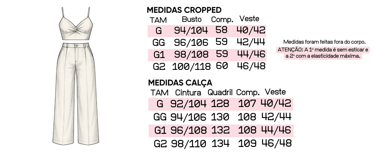 O cropped apresenta modelagem moderna com alças finas e detalhe franzido no busto, garantindo delicadeza e feminilidade. Nas costas, conta com lastex, que proporciona ajuste perfeito ao corpo e liberdade de movimentos. Já a calça pantalona possui cintura alta com elástico embutido, que oferece praticidade e conforto, além de vir com forro interno, garantindo segurança e zero transparência. Sua modelagem ampla confere movimento e elegância ao visual.