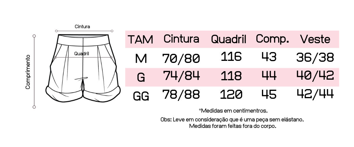 Atente-se as medidas na hora da compra para que receba a sua peça exatamente do tamanho que deseja