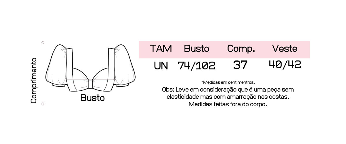 - Amarração nas costas que faz seja uma peça prática de se vestir, e que se ajuste melhor em qualquer busto do 36 ao 42;