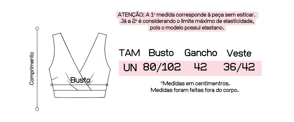Recomendamos que tenha em mãos suas medidas de busto, cintura e quadril para que possa fazer a comparação com as medidas da peça, pois cada uma tem suas medidas tiradas exclusivamente.
