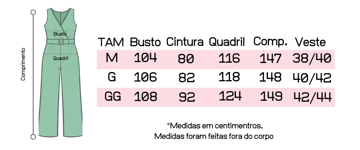 Recomendamos que tenha em mãos suas medidas de busto, cintura e quadril para que possa fazer a comparação com as medidas da peça, pois cada uma tem suas medidas tiradas exclusivamente.