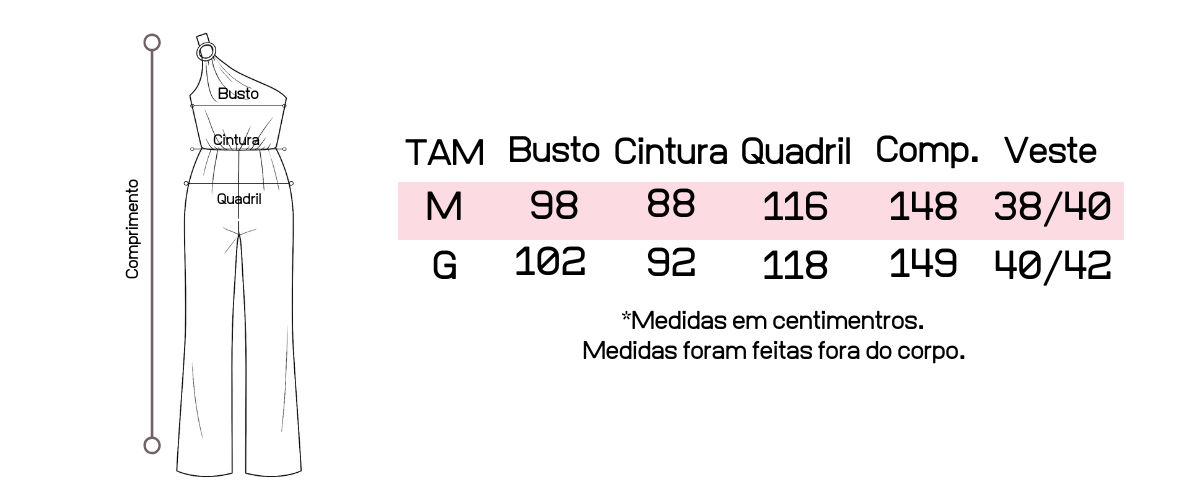 Recomendamos que tenha em mãos suas medidas de busto, cintura e quadril para que possa fazer a comparação com as medidas da peça, pois cada uma tem suas medidas tiradas exclusivamente.