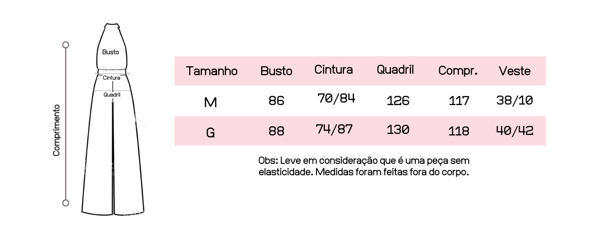 - Parte cima do macacão mais ajustada e pernas possuem caimento leve e fluído;