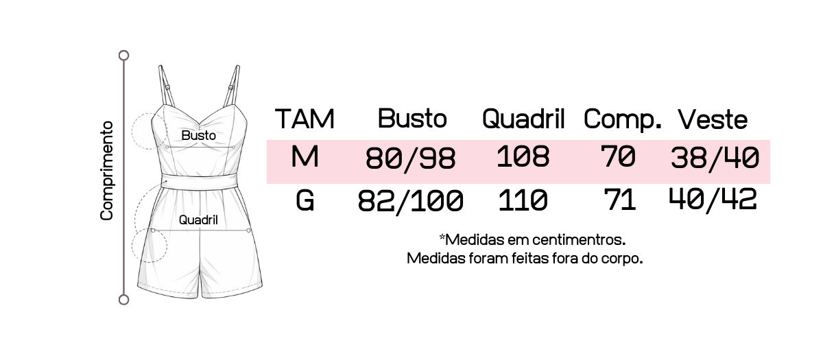 Recomendamos que tenha em mãos suas medidas de busto, cintura e quadril para que possa fazer a comparação com as medidas da peça, pois cada uma tem suas medidas tiradas exclusivamente.