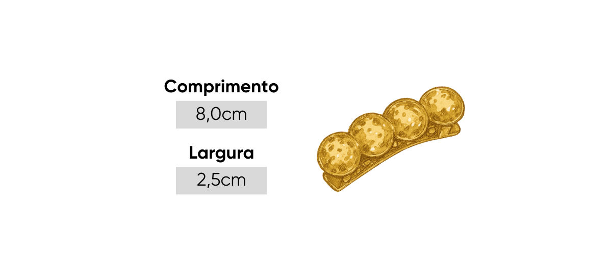 A Presilha Suíça é o acessório perfeito para quem busca elegância com um toque moderno. Seu design em esferas texturizadas de metal dourado cria um visual refinado e contemporâneo, ideal para valorizar penteados soltos, coques ou semi-presos.