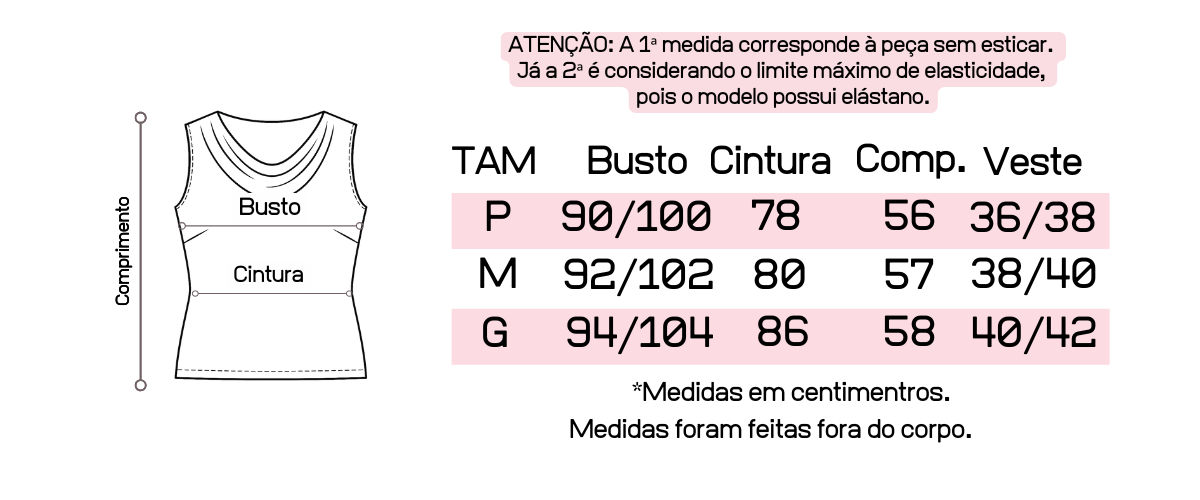 Recomendamos que tenha em mãos suas medidas de busto, cintura e quadril para que possa fazer a comparação com as medidas da peça, pois cada uma tem suas medidas tiradas exclusivamente.