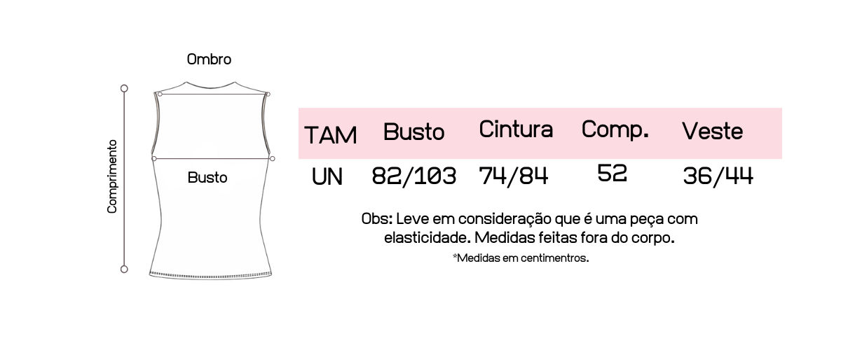 Recomendamos que tenha em mãos suas medidas de busto, cintura e quadril para que possa fazer a comparação com as medidas da peça, pois cada uma tem suas medidas tiradas exclusivamente.