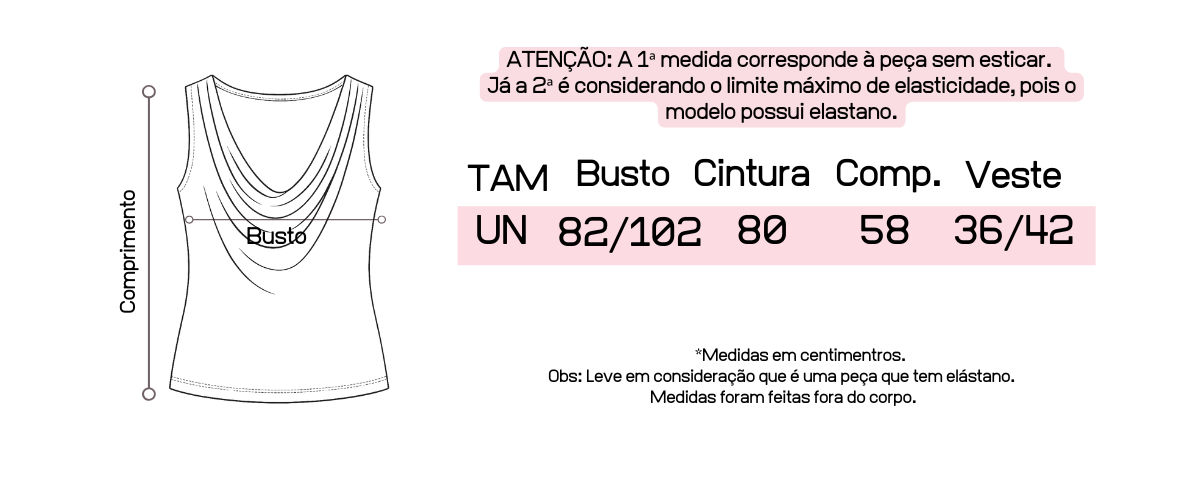 Recomendamos que tenha em mãos suas medidas de busto, cintura e quadril para que possa fazer a comparação com as medidas da peça, pois cada uma tem suas medidas tiradas exclusivamente.
