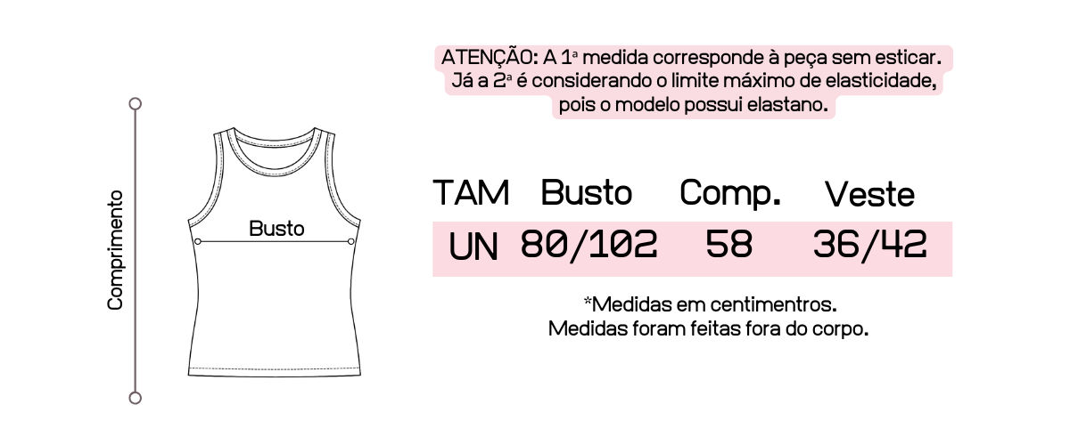 Recomendamos que tenha em mãos suas medidas de busto, cintura e quadril para que possa fazer a comparação com as medidas da peça, pois cada uma tem suas medidas tiradas exclusivamente.