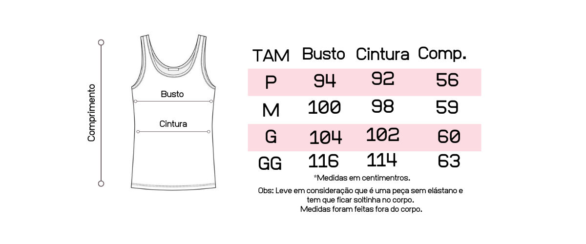 - Regata em crepe proporcionando leveza e maciez, com maior conforto e frescor,
