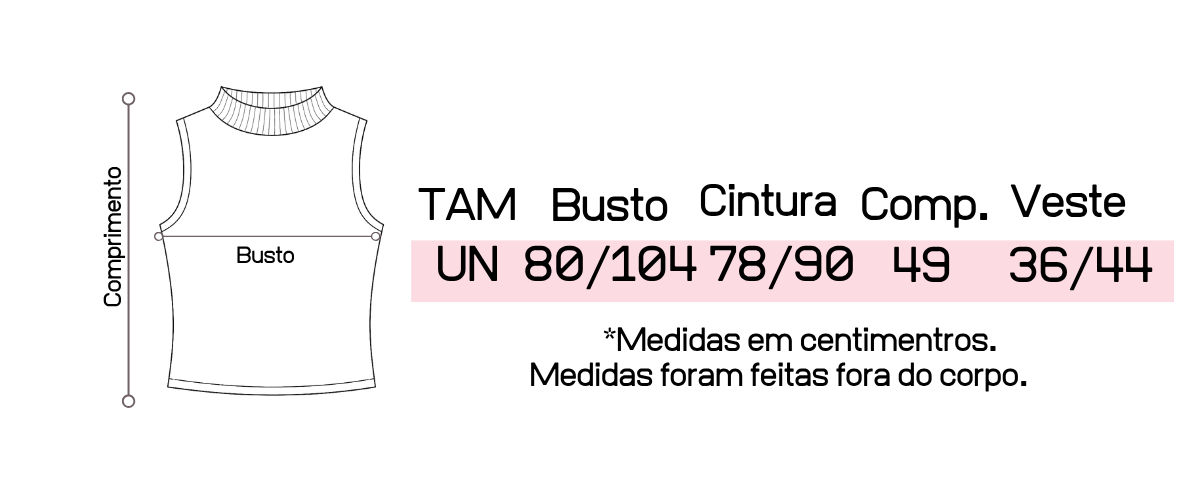 Recomendamos que tenha em mãos suas medidas de busto, cintura e quadril para que possa fazer a comparação com as medidas da peça, pois cada uma tem suas medidas tiradas exclusivamente.