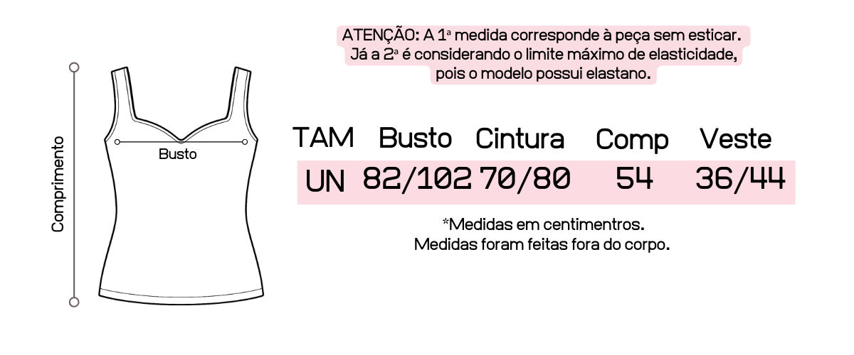 Recomendamos que tenha em mãos suas medidas de busto, cintura e quadril para que possa fazer a comparação com as medidas da peça, pois cada uma tem suas medidas tiradas exclusivamente.