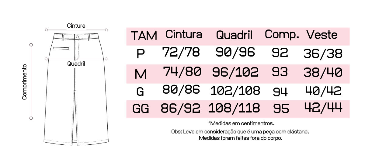 Atente-se as medidas na hora da compra para que receba a sua peça exatamente do tamanho que deseja