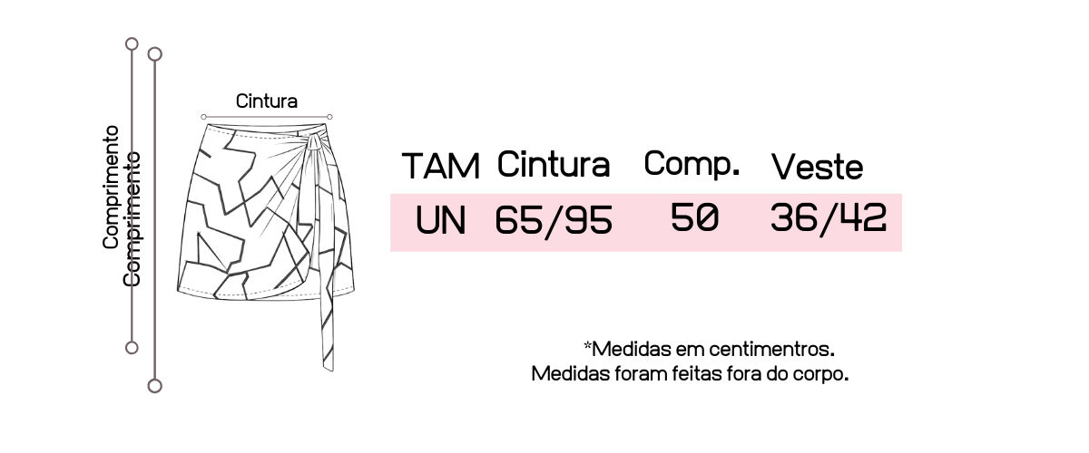 O transpasse frontal com amarração lateral traz charme e movimento à peça, permitindo ajuste ao corpo de forma prática e elegante. A estampa geométrica moderna deixa o visual marcante e versátil, ideal para combinar com bodies, regatas ou camisas, tanto para o dia quanto para a noite.