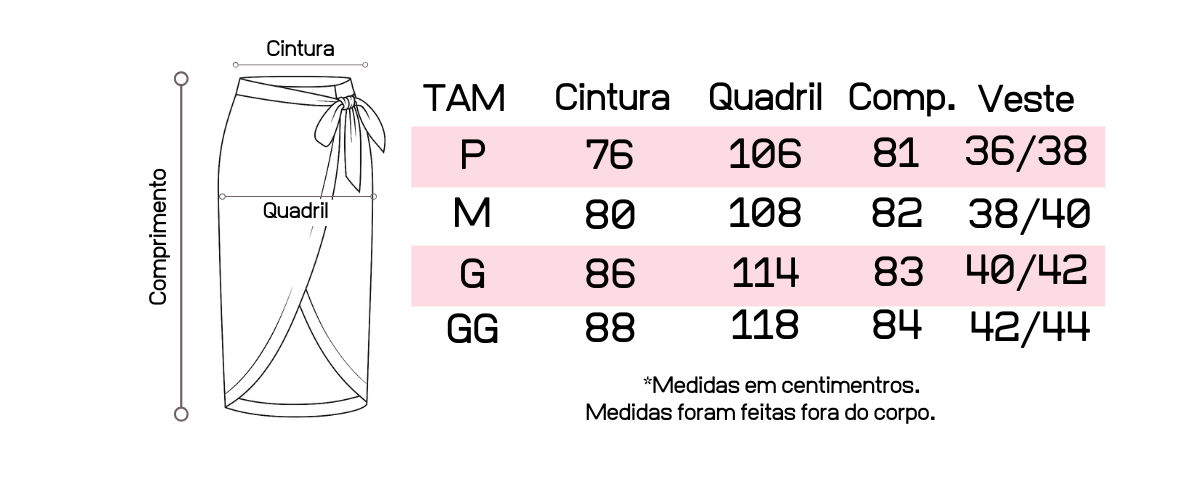Recomendamos que tenha em mãos suas medidas de busto, cintura e quadril para que possa fazer a comparação com as medidas da peça, pois cada uma tem suas medidas tiradas exclusivamente.
