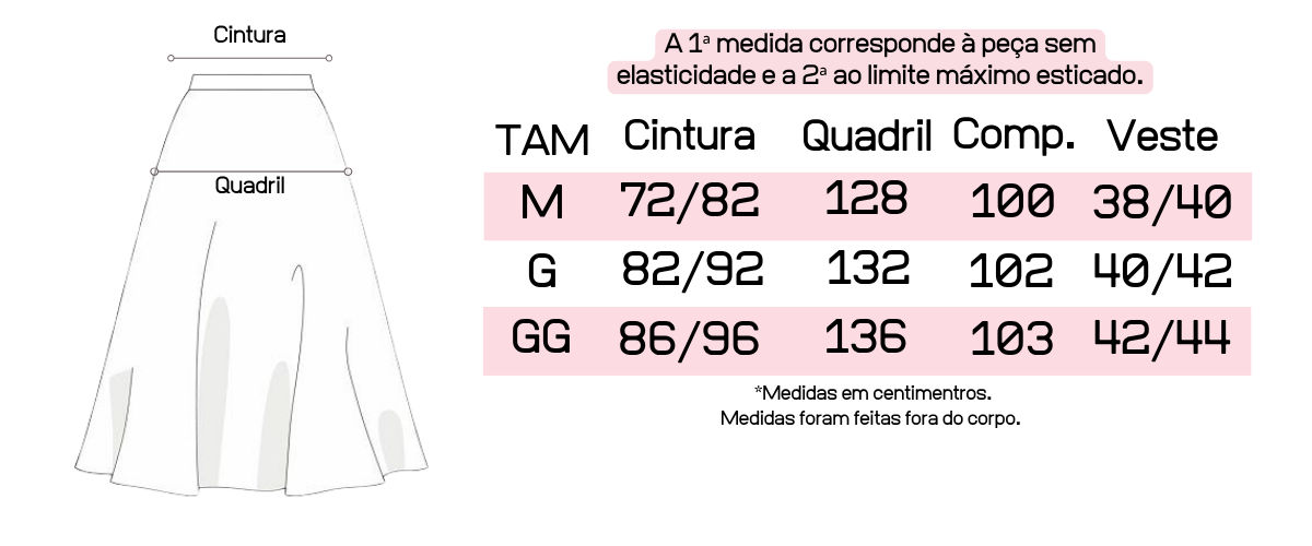 Gisele veste tamanhos 40/42 no quadril e 44 no busto, servindo como referência para ajudar na escolha do tamanho certo.