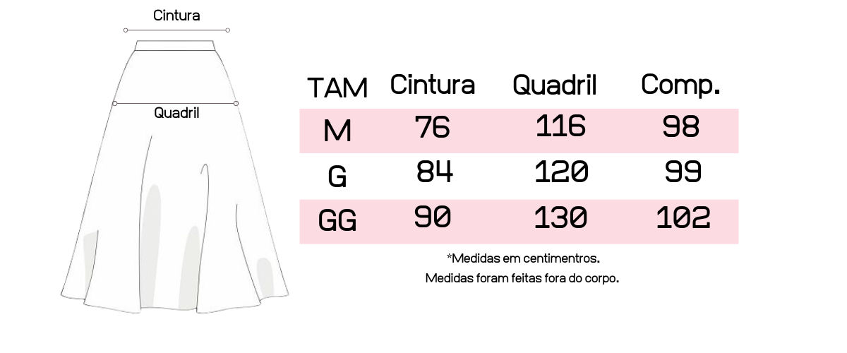 -  Modelo em evasê, levemente godê, o que torna a saia super elegante;