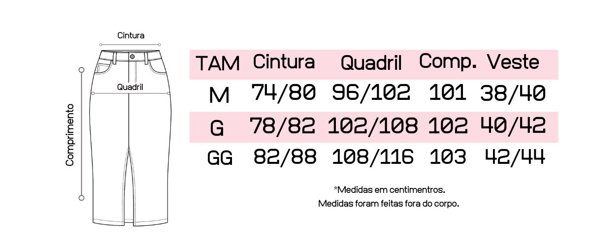 Atente-se as medidas na hora da compra para que receba a sua peça exatamente do tamanho que deseja