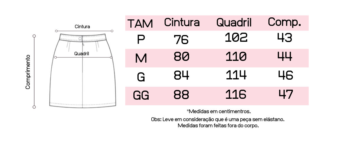 Atente-se as medidas na hora da compra para que receba a sua peça exatamente do tamanho que deseja