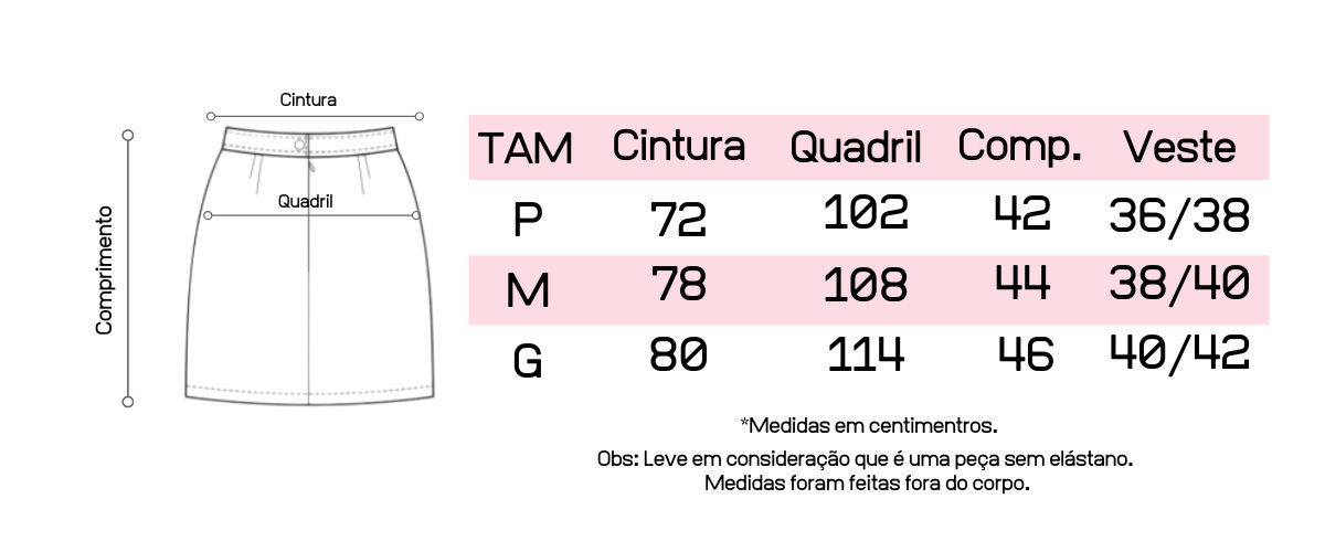Atente-se as medidas na hora da compra para que receba a sua peça exatamente do tamanho que deseja