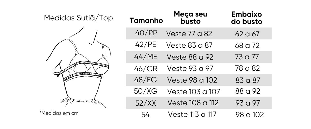 | Composição | 86% Poliamida; 14% Elastano; Bojo 100% Poliéster - Renda 81% Poliamida; 19% Elastano |