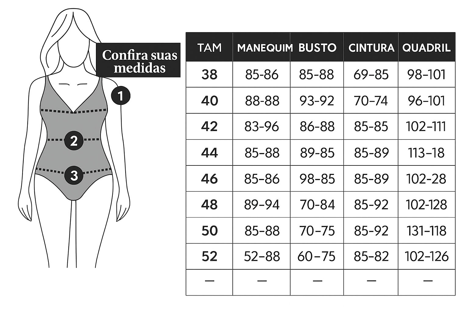 Recomendamos que tenha em mãos suas medidas de busto, cintura e quadril para que possa fazer a comparação com as medidas da peça, pois cada uma tem suas medidas tiradas exclusivamente.