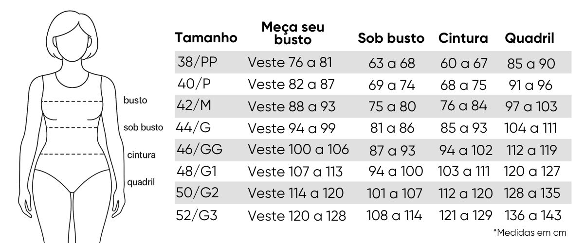 Sendo uma marca nacional, temos como objetivo realçar a beleza dos corpos de mulheres reais brasileiras e entregar peças fiéis aos anúncios. Pelo que todas as nossas coleções são desenvolvidas tendo em conta as nossas particularidades nacionais. Gisele usa tamanhos 40/42 e G de quadril e 44 de busto. Contamos com um time para auxiliar na sua escolha de tamanhos.