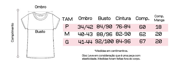 Possui modelagem ampla, veste do 36 ao 44. Indicamos consultar a tabela de medidas para mais informações.