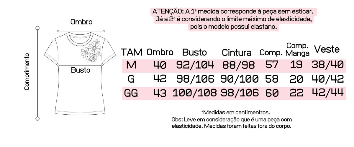 Recomendamos que tenha em mãos suas medidas de busto, cintura e quadril para que possa fazer a comparação com as medidas da peça, pois cada uma tem suas medidas tiradas exclusivamente.