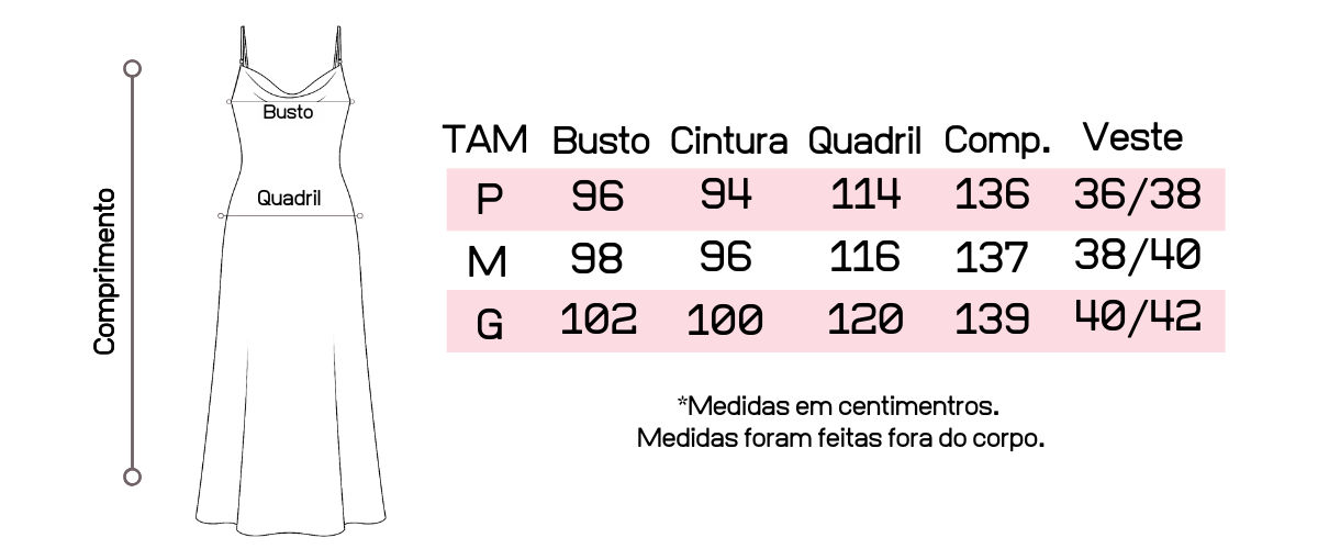 Recomendamos que tenha em mãos suas medidas de busto, cintura e quadril para que possa fazer a comparação com as medidas da peça, pois cada uma tem suas medidas tiradas exclusivamente.
