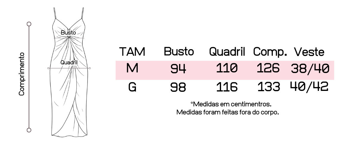Recomendamos que tenha em mãos suas medidas de busto, cintura e quadril para que possa fazer a comparação com as medidas da peça, pois cada uma tem suas medidas tiradas exclusivamente.