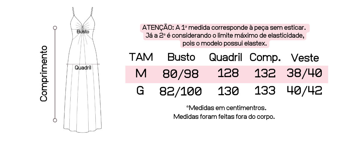 Recomendamos que tenha em mãos suas medidas de busto, cintura e quadril para que possa fazer a comparação com as medidas da peça, pois cada uma tem suas medidas tiradas exclusivamente.