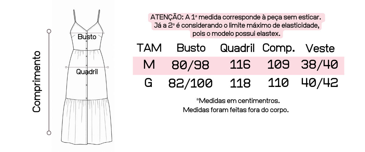 Recomendamos que tenha em mãos suas medidas de busto, cintura e quadril para que possa fazer a comparação com as medidas da peça, pois cada uma tem suas medidas tiradas exclusivamente.