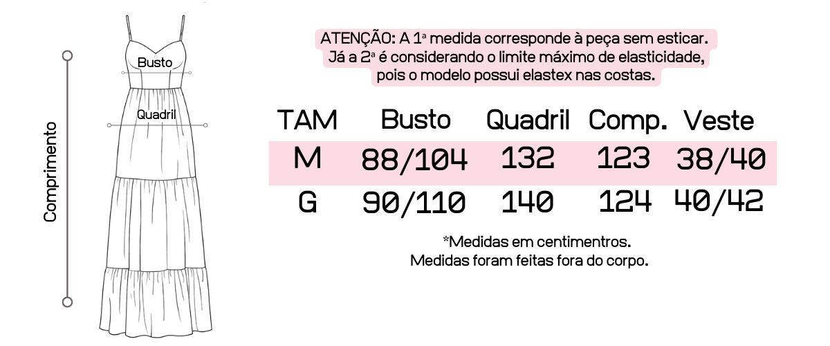 Recomendamos que tenha em mãos suas medidas de busto, cintura e quadril para que possa fazer a comparação com as medidas da peça, pois cada uma tem suas medidas tiradas exclusivamente.