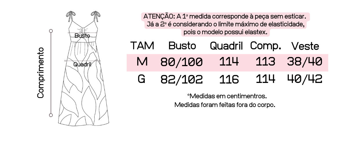 Recomendamos que tenha em mãos suas medidas de busto, cintura e quadril para que possa fazer a comparação com as medidas da peça, pois cada uma tem suas medidas tiradas exclusivamente.