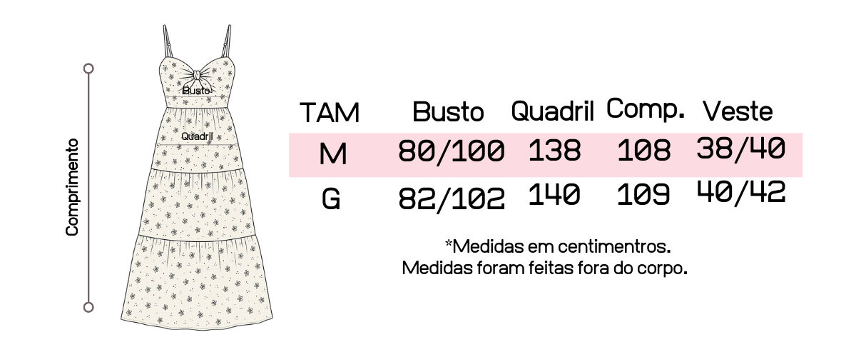 Recomendamos que tenha em mãos suas medidas de busto, cintura e quadril para que possa fazer a comparação com as medidas da peça, pois cada uma tem suas medidas tiradas exclusivamente.