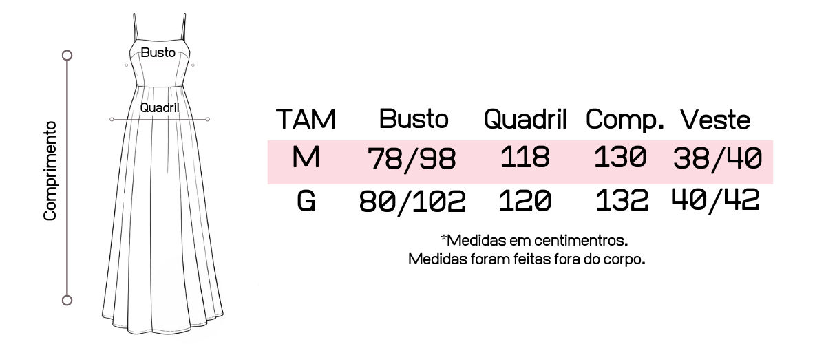 Gisele veste tamanhos 40/42 no quadril e 44 no busto, servindo como referência para ajudar na escolha do tamanho certo.