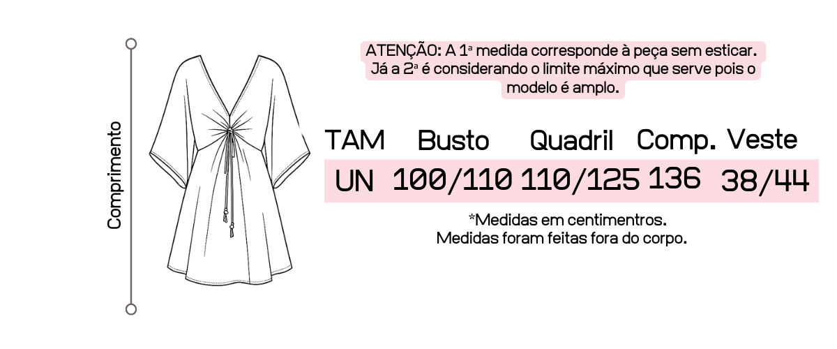 Recomendamos que tenha em mãos suas medidas de busto, cintura e quadril para que possa fazer a comparação com as medidas da peça, pois cada uma tem suas medidas tiradas exclusivamente.