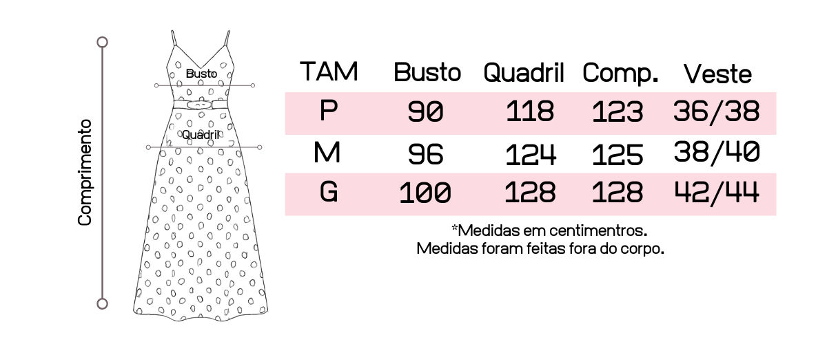 Recomendamos que tenha em mãos suas medidas de busto, cintura e quadril para que possa fazer a comparação com as medidas da peça, pois cada uma tem suas medidas tiradas exclusivamente.