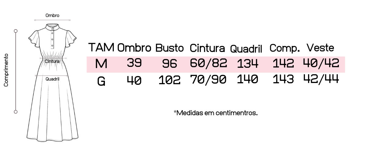 Recomendamos que tenha em mãos suas medidas de busto, cintura e quadril para que possa fazer a comparação com as medidas da peça, pois cada uma tem suas medidas tiradas exclusivamente.