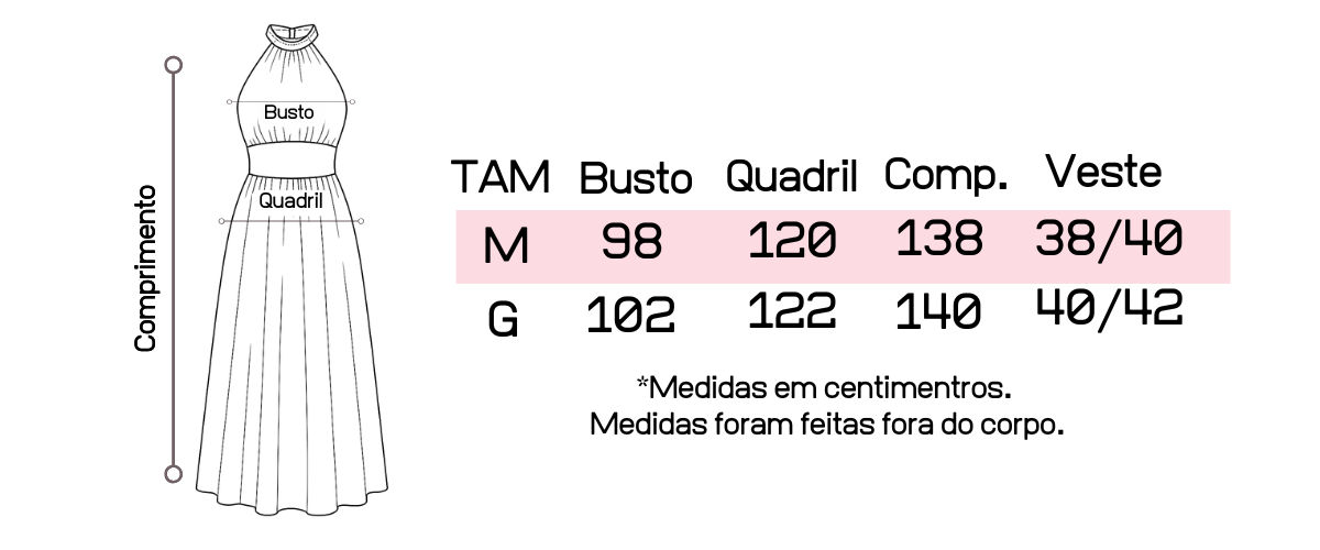 Gisele veste tamanhos 40/42 no quadril e 44 no busto, servindo como referência para ajudar na escolha do tamanho certo.