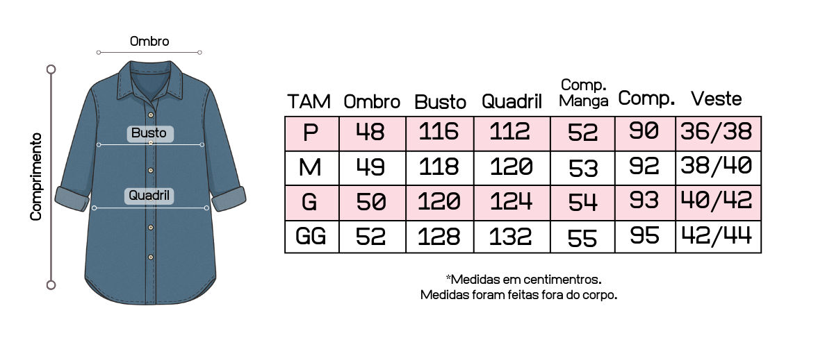 Recomendamos que tenha em mãos suas medidas de busto, cintura e quadril para que possa fazer a comparação com as medidas da peça, pois cada uma tem suas medidas tiradas exclusivamente.