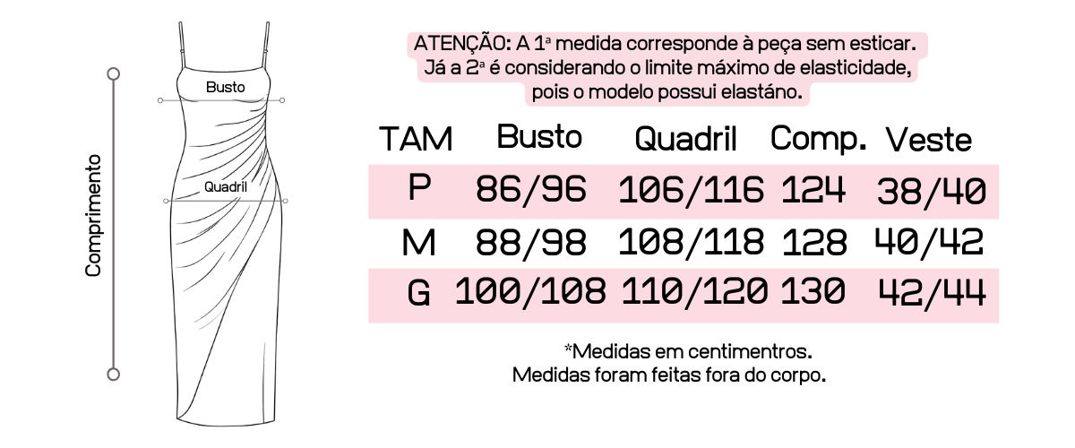 Recomendamos que tenha em mãos suas medidas de busto, cintura e quadril para que possa fazer a comparação com as medidas da peça, pois cada uma tem suas medidas tiradas exclusivamente.