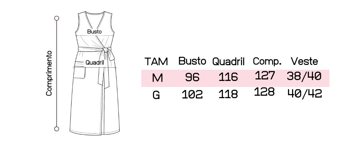 Recomendamos que tenha em mãos suas medidas de busto, cintura e quadril para que possa fazer a comparação com as medidas da peça, pois cada uma tem suas medidas tiradas exclusivamente.