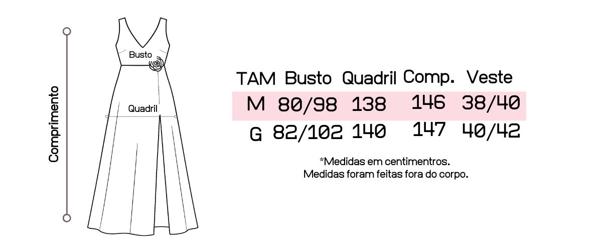 Recomendamos que tenha em mãos suas medidas de busto, cintura e quadril para que possa fazer a comparação com as medidas da peça, pois cada uma tem suas medidas tiradas exclusivamente.