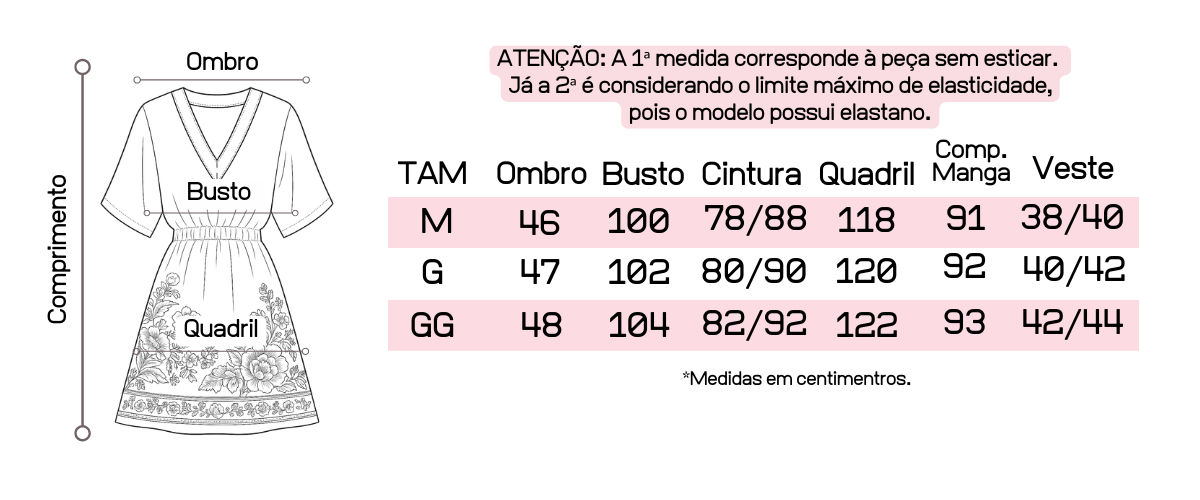 Recomendamos que tenha em mãos suas medidas de busto, cintura e quadril para que possa fazer a comparação com as medidas da peça, pois cada uma tem suas medidas tiradas exclusivamente.