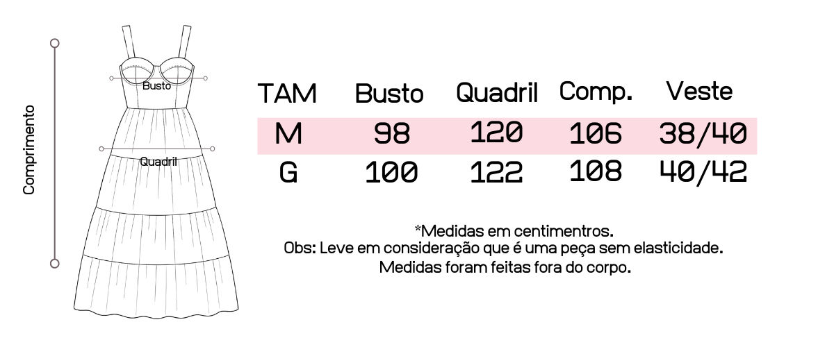 Recomendamos que tenha em mãos suas medidas de busto, cintura e quadril para que possa fazer a comparação com as medidas da peça, pois cada uma tem suas medidas tiradas exclusivamente.